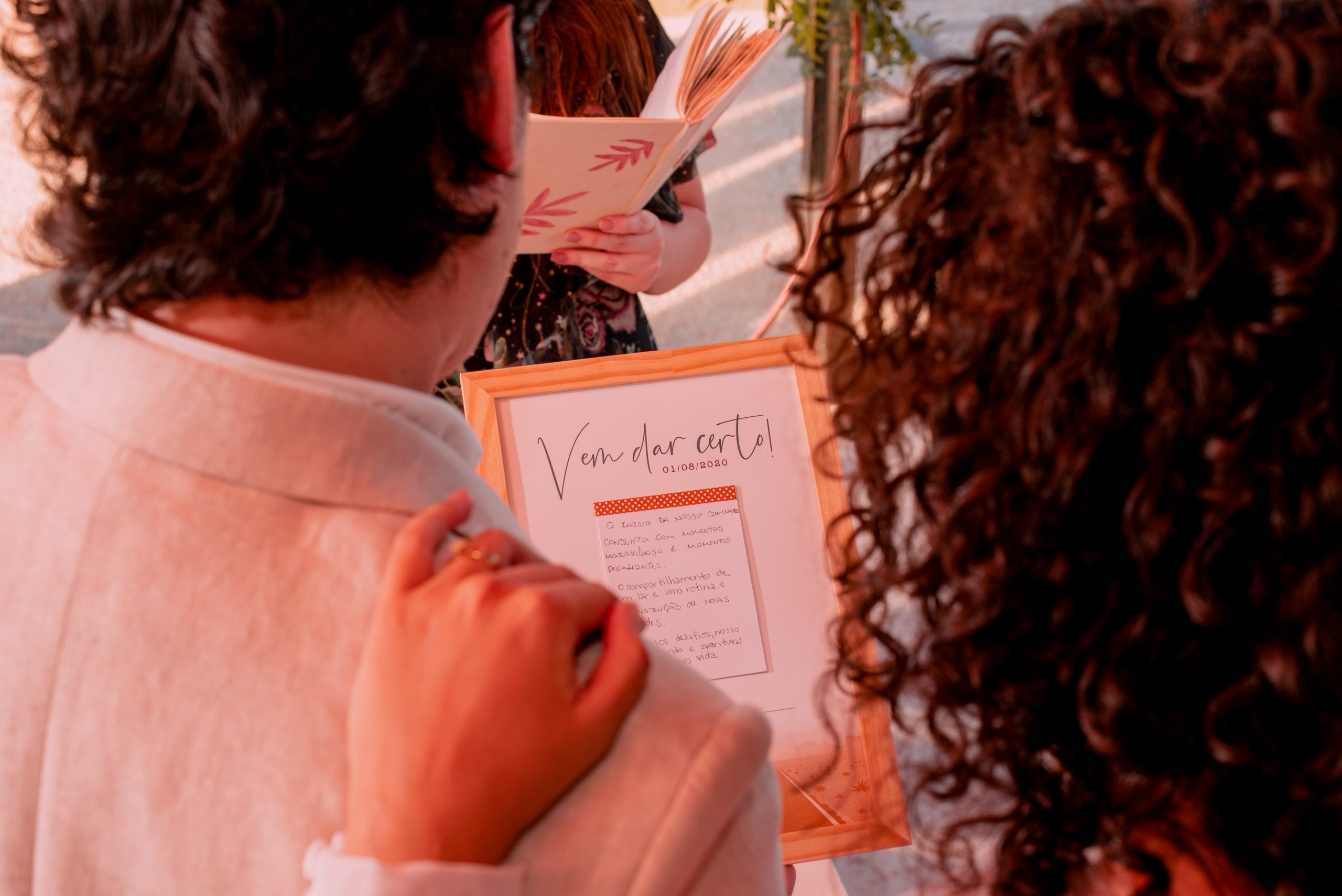Mas, olhando pra vocês assim, acho que Manoel mudaria para o passado este tempo verbal. É isso o que estamos fazendo neste dia 1º de agosto. Viemos testemunhar vocês, Carol e Felipe, colocarem gente dentro da palavra amor“.