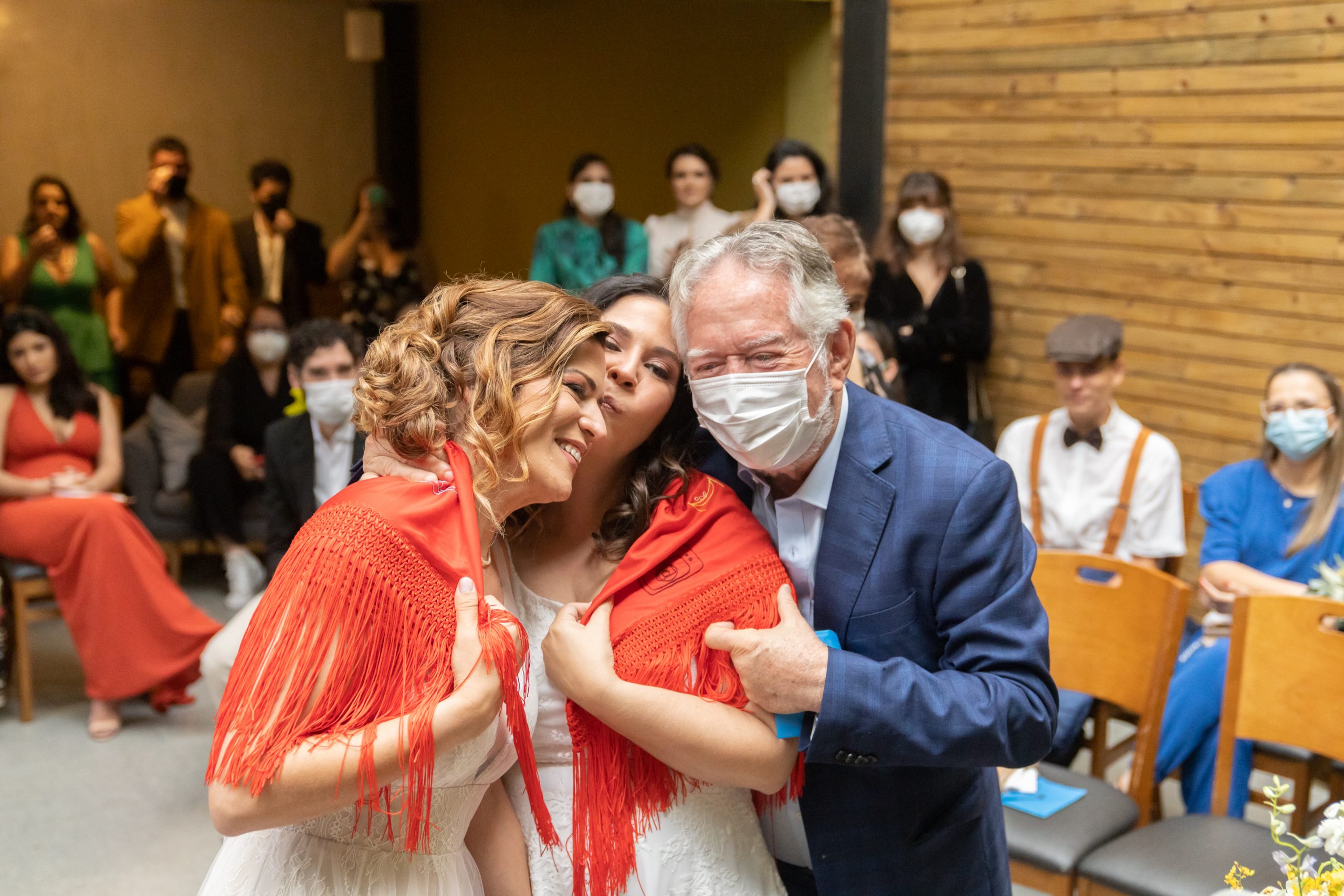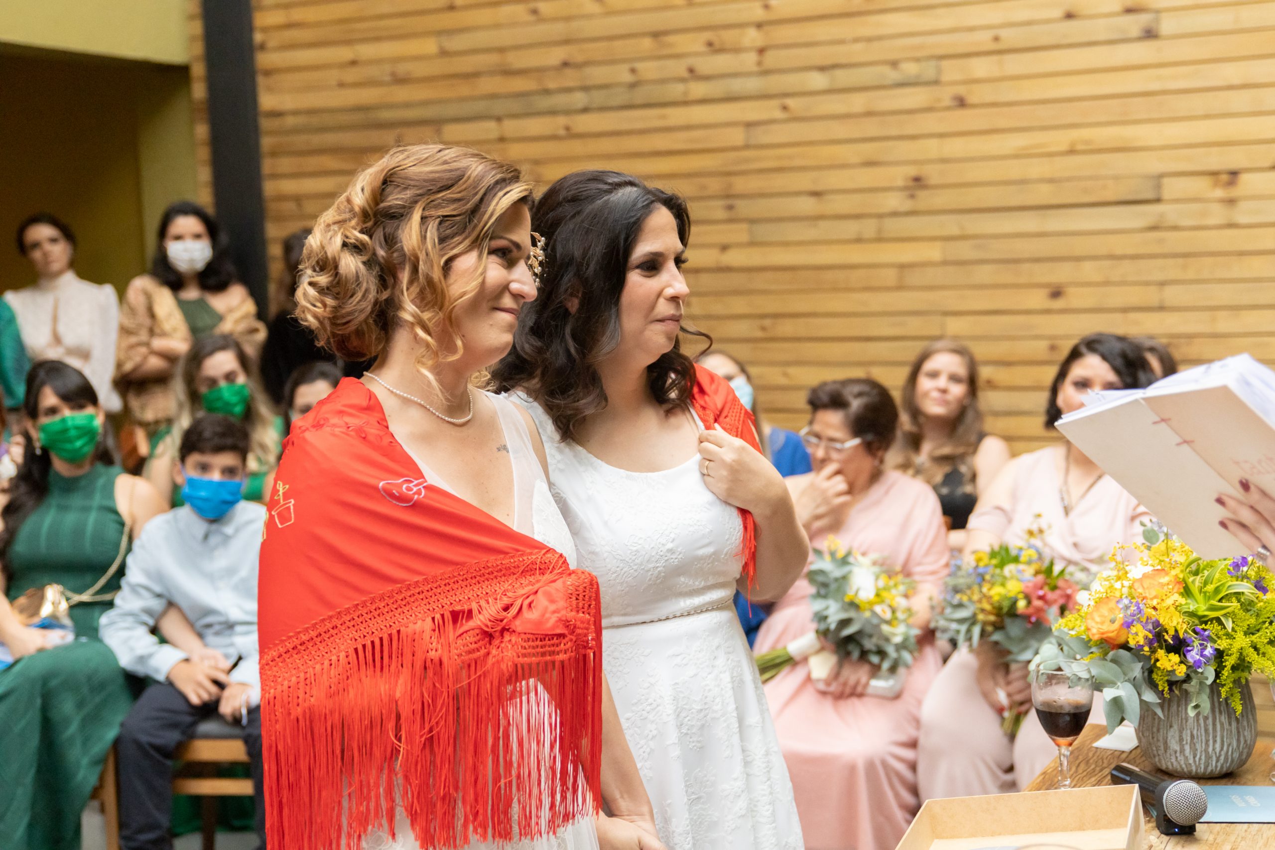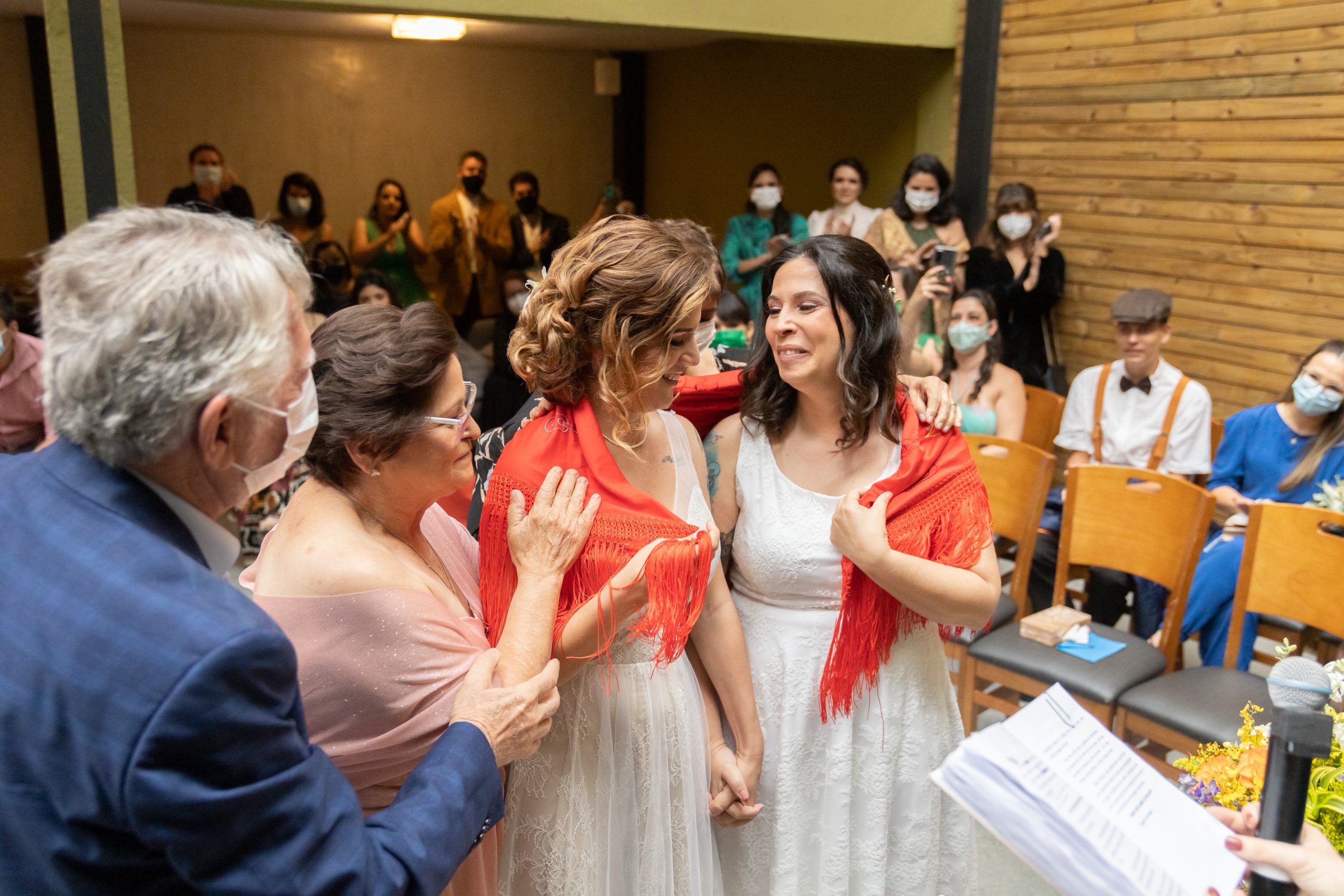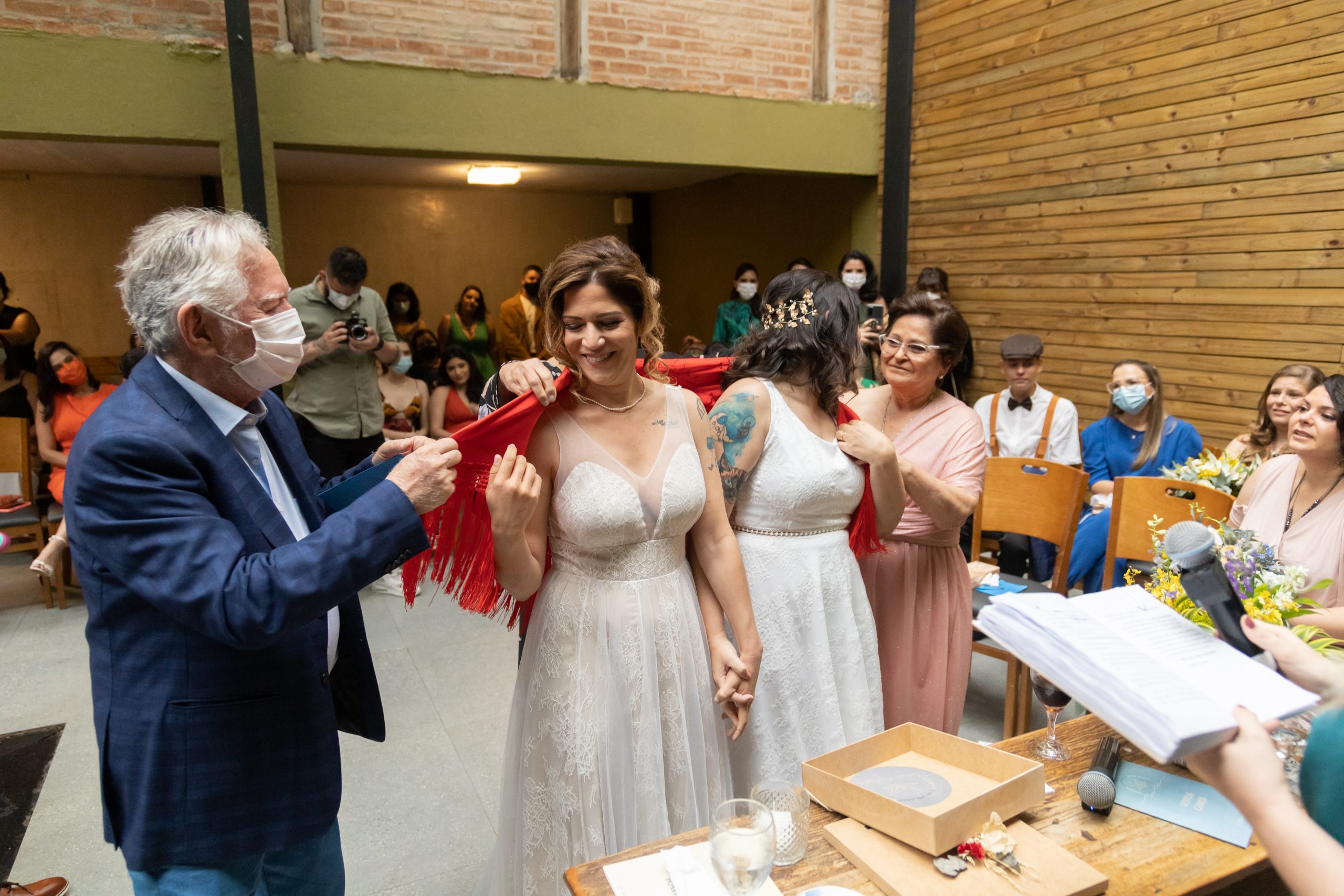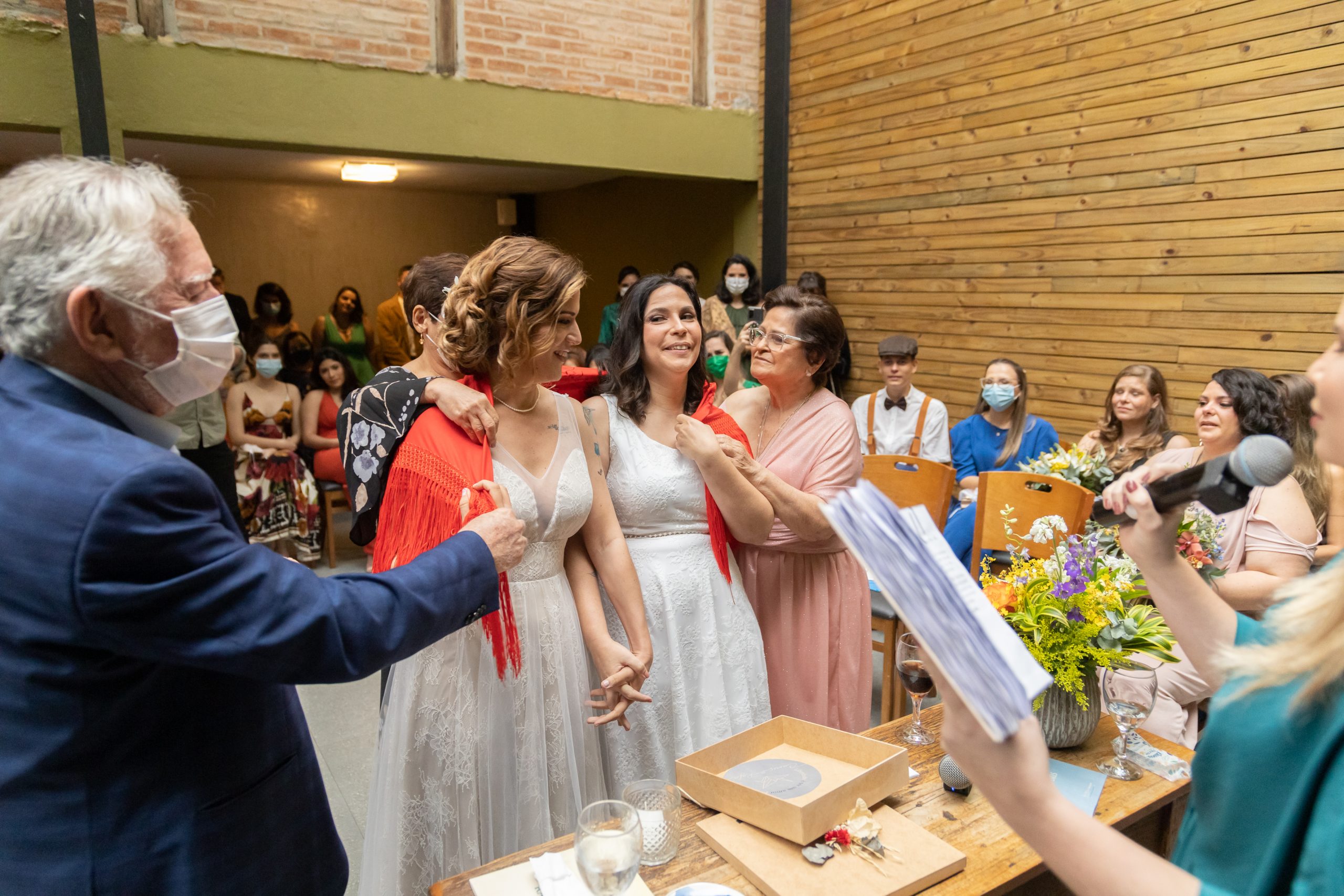 Pedi, então, que os pais delas viessem até o altar, representando todos os convidados, e envolvessem as nossas queridas noivas com esse manto, acreditando que bons desejos são uma redoma forte e poderosa, uma capa de proteção, um aconchego em dias difíceis.